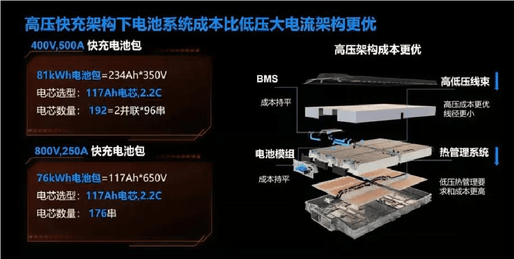高压快充技术,已成为目前车企实现快充的主流选择。在高电压系统下,电动汽车的电驱系统效率会提升,从而增加续航里程。高电压模式相较于大电流模式,具有高效充电SOC区间更大、充电功率峰值更高、技术难度相对较小、成本相对可控等优势。