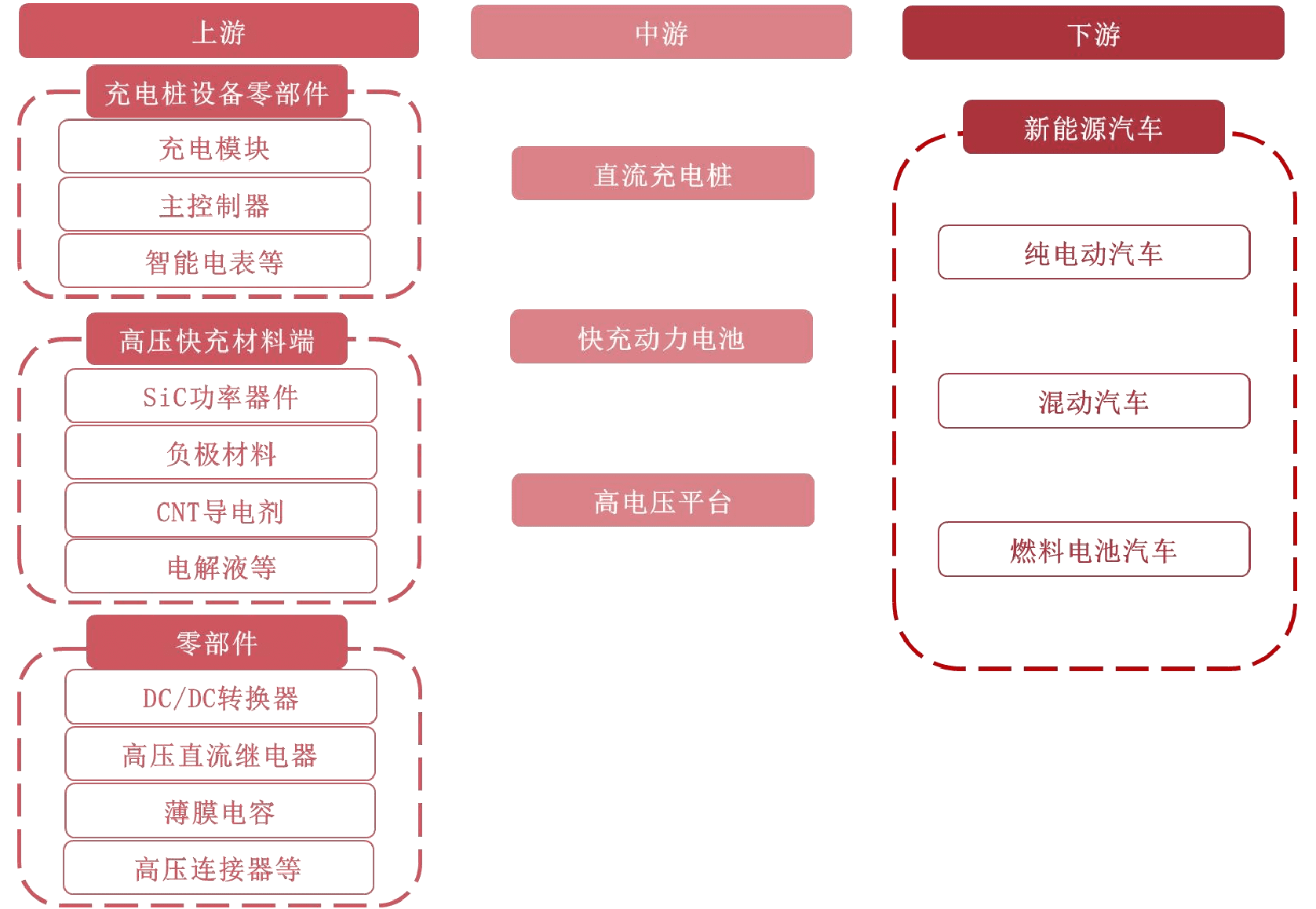 从产业链来看,上游包括充电桩设备零部件、高压快充材料以及相关零部件等;中游为直流充电桩、快充动力电池、高电压平台等;下游则应用于新能源汽车充电。