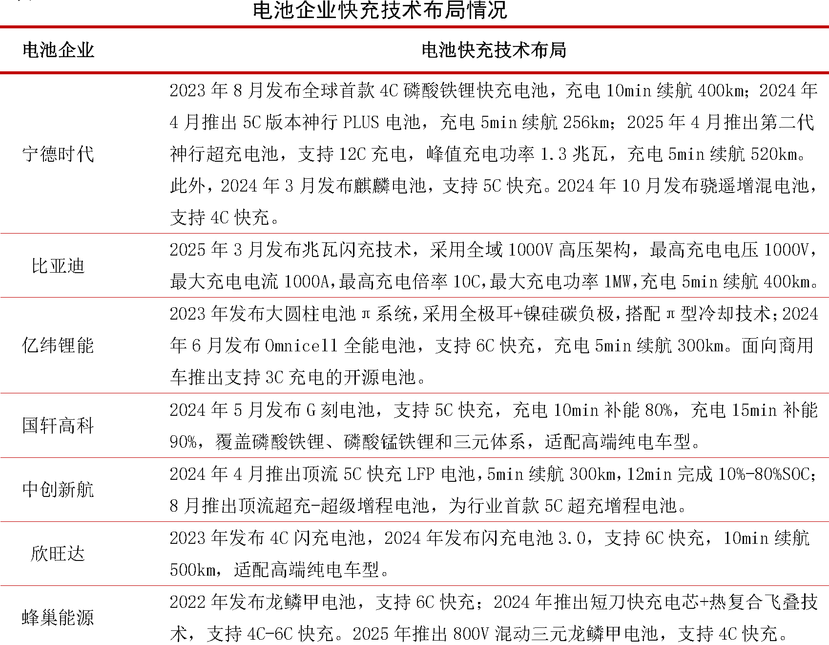 目前动力电池快充技术已进入4C-6C,并持续向8C-12C的更高倍率突破。2025年龙头企业宁德时代和比亚迪推出兆瓦闪充电池。2025年3月,比亚迪发布兆瓦闪充电池,支持10C快充,充电功率突破兆瓦级,充电5分钟增加400公里续航。2025年4月,宁德时代发布第二代神行超充电池,支持12C快充,峰值充电功率1.3兆瓦,充电5分钟增加520公里续航。此外亿纬锂能、欣旺达、国轩高科等企业的快充电池产品不断应用落地。