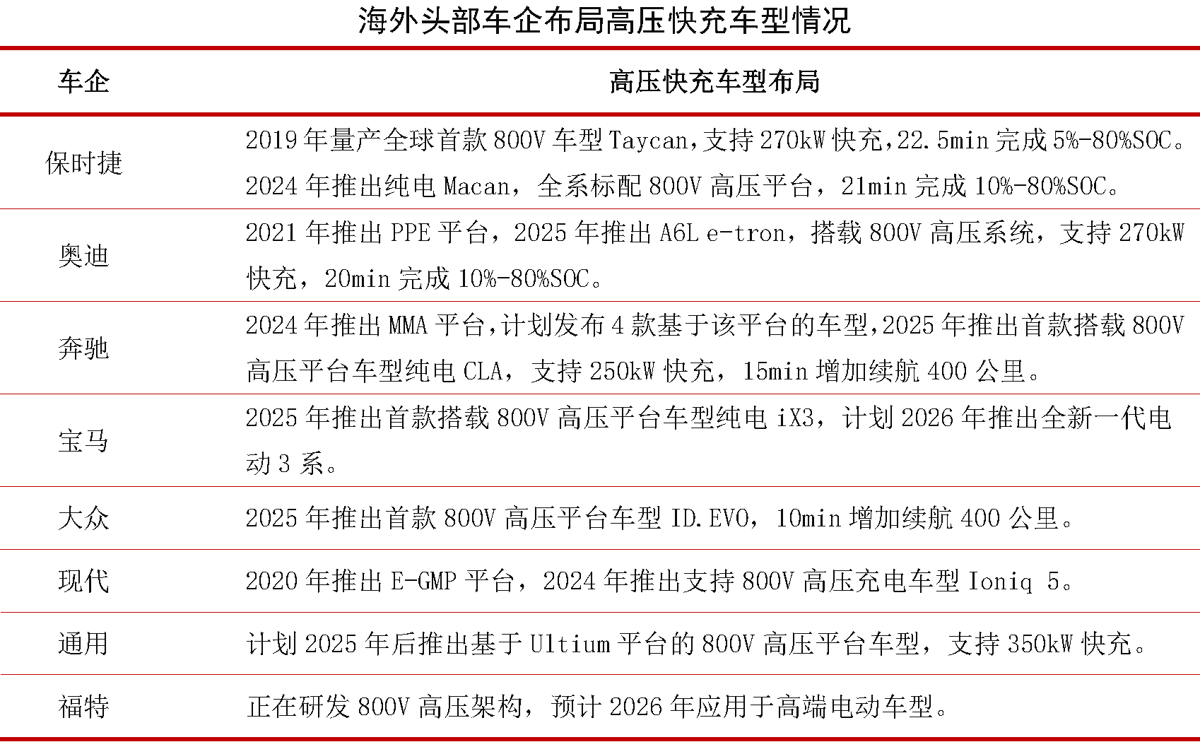 海外方面,保时捷率先推出高压平台车型,奥迪、奔驰、宝马、大众、现代等车企在近两年相继推出,通用、福特等车企计划将于未来几年推出。