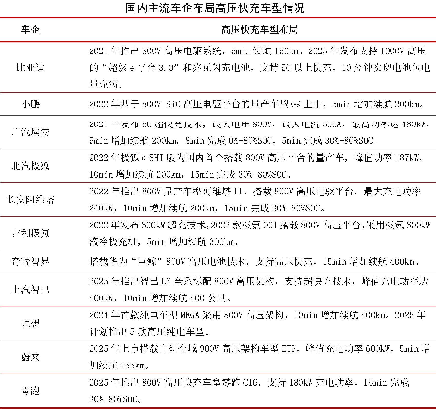 国内方面,比亚迪、小鹏、广汽埃安等车企已在快充市场中占据领先地位。极狐、阿维塔、极氪、智界、智己等多个新能源品牌通过多家企业合作和资源整合,正在迅速提升其在高压快充领域的竞争力。此外,理想、蔚来、零跑等新势力车企在推出高压快充车型方面相对较晚,但也正在积极追赶行业前列。