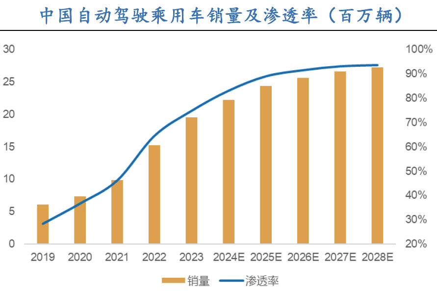 不仅如此,自动驾驶乘用车销量和渗透率也在持续攀高。据弗若斯特沙利文数据,预计2024-2028年全球自动驾驶乘用车销量CAGR达到6.5%,渗透率从72.5%提升至87.9%。预计2024-2028年我国自动驾驶乘用车销量CAGR达5.2%,渗透率从83%提升至93.5%,渗透率高于全球水平。