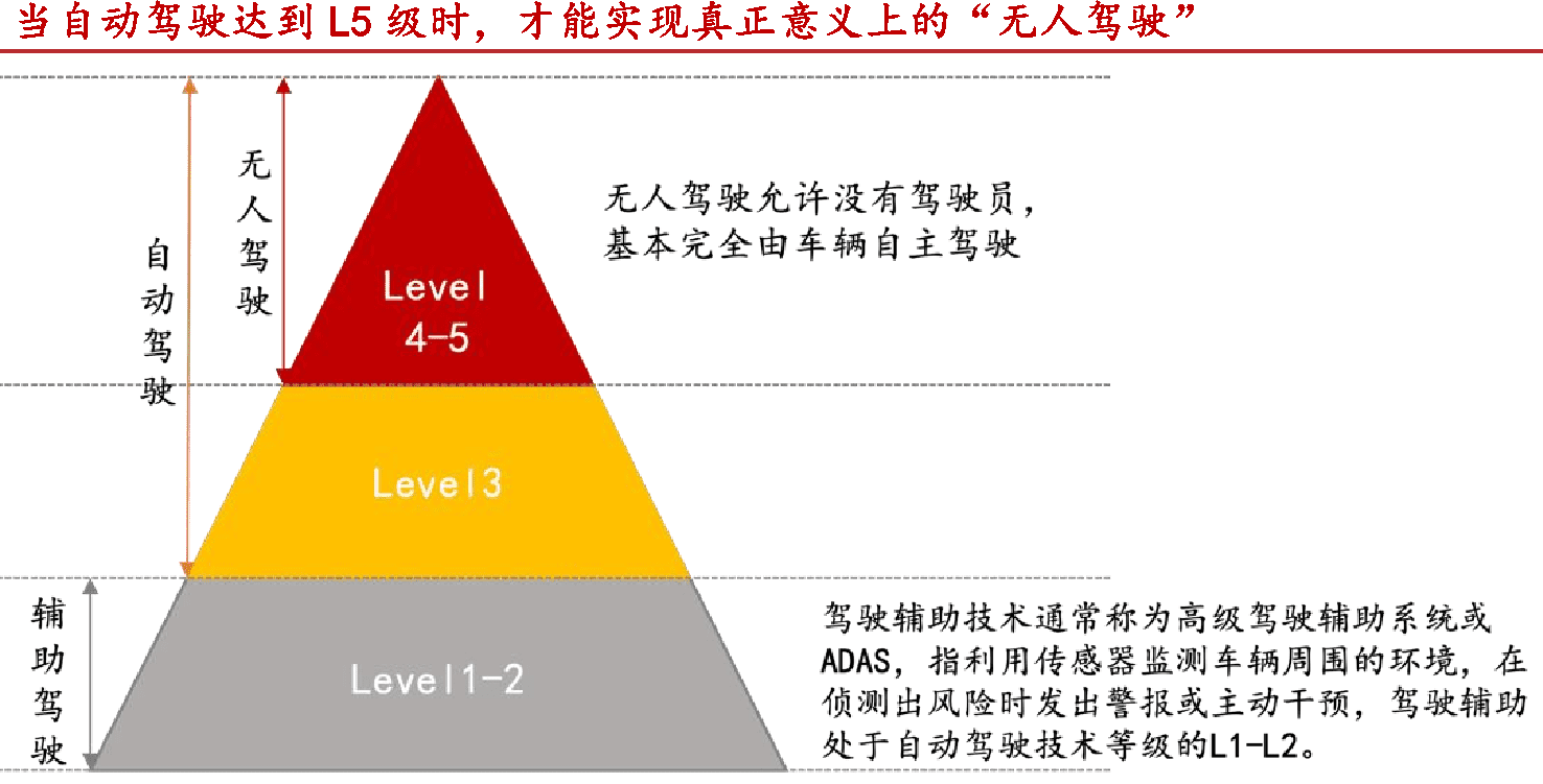 具体来看,L0是无自动驾驶;L1-L4是在限定场景下由系统完成相应的驾驶行为,只有当自动驾驶达到L5级时,才能实现完全的自动化驾驶,且任何情况下都无需人类接管,即真正意义上的“无人驾驶”。值得一提的是,L4级自动驾驶只要在系统指定适用的场景下也是“无人驾驶”,可以说,L4相当于限定场景下的L5。