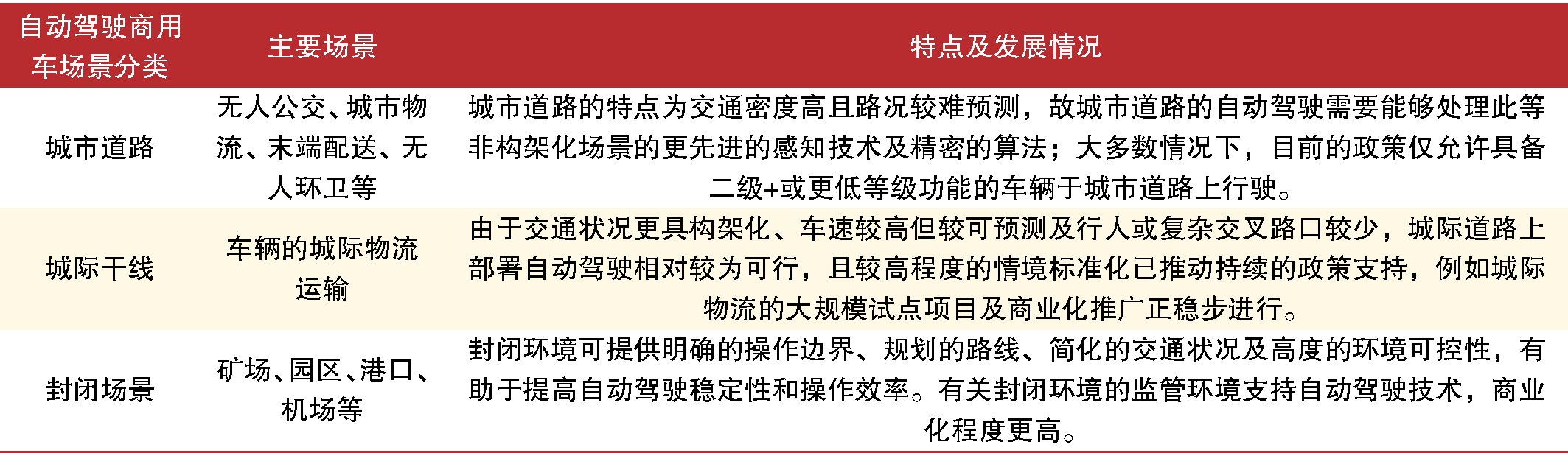 自动驾驶商用车主要应用于城市道路、城际干线、封闭环境三个场景。