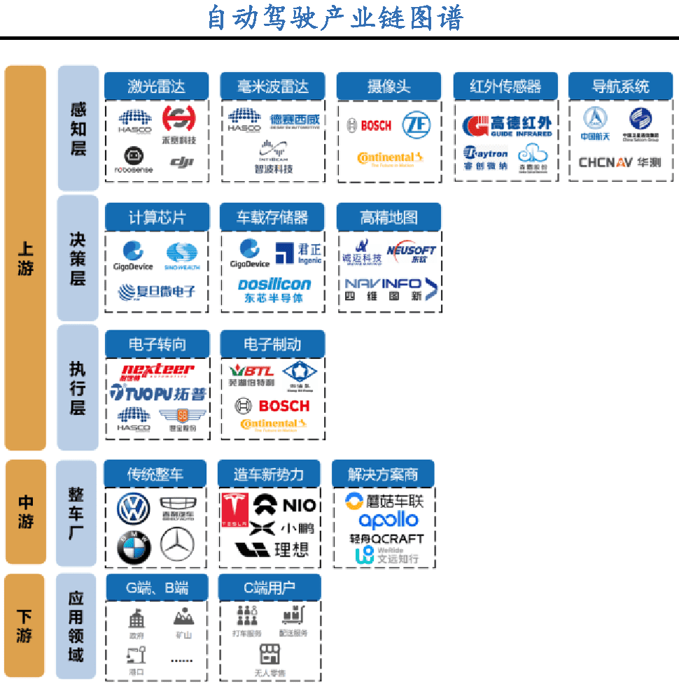 从产业链来看,上游可分为感知层、决策层、执行层。感知层主要为激光雷达、毫米波雷达、摄像头等视觉传感器,通过传感器实现精准感知和环境检测。决策层的计算芯片、车载存储器等器件主要负责处理感知层的视觉信息,并作出相应决策。执行层接收决策层的指令,控制车身执行相关命令,从而做出避让、停泊等行为。中游主要包括整车厂和平台层,整车厂也分为传统车厂和造车新势力,方案供应商则主要为汽车Tier1和提供自动驾驶服务的高科技公司。下游则为自动驾驶需求所行生的多元化应用场景,包括G端、B端和C端。